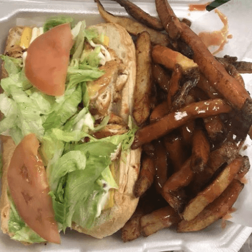Seasoned Chopped Chicken Breast, Grilled Onions, American Cheese, Sweet & Hot Peppers, Special Sauce on a Bed of Fresh Fries