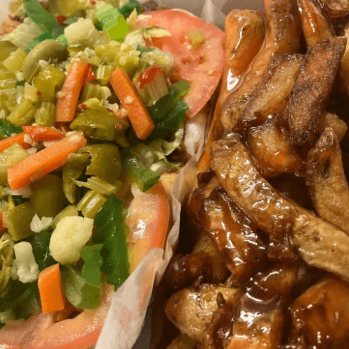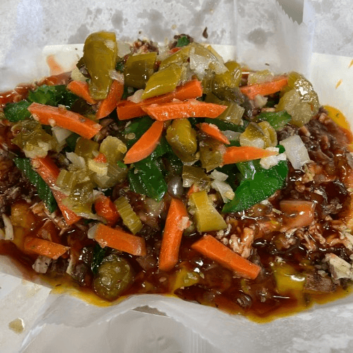 Seasoned Chopped Ribeye Steak, Grilled Onions, American Cheese, Sweet & Hot Peppers, Special Sauce on a Bed of Fresh Fries