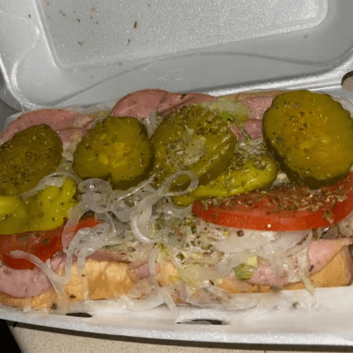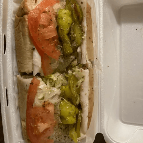 Lettuce, Tomatoes, American Cheese, Fresh Onions, Pickles, Herbs & Oil, Pepperoncini Peppers, on a Fresh Hoagy Roll